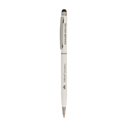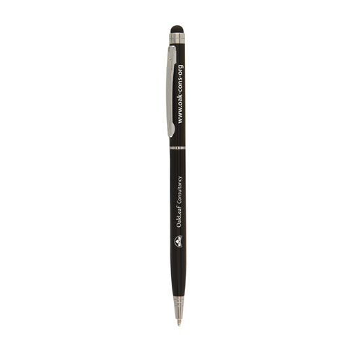 This stylish ultra slim ballpoint pen features a lacquered finished barrel with shiny chrome trim. The soft touch stylus is compatible with all smart phones and tablets. Twist action.