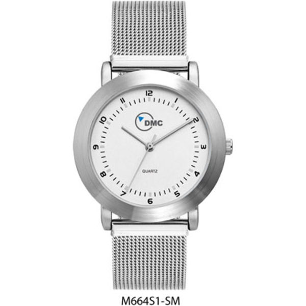 Alloy case, matt silver dial with black printed indexes, S/S mesh band