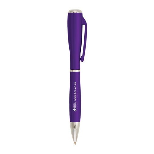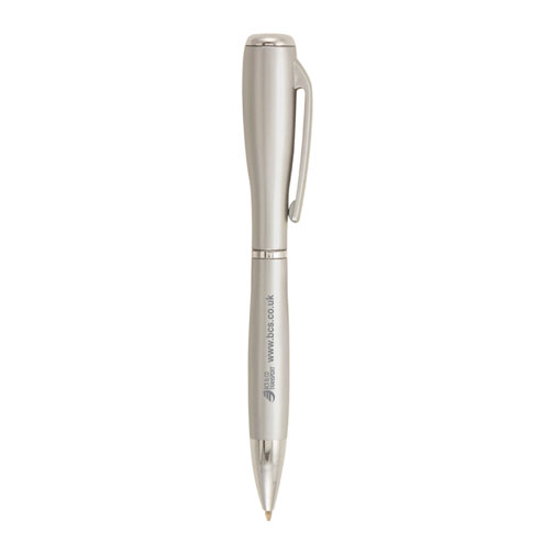 The J Brown combines the convenience of a pocket flashlight with a smooth writing pen in one unique product. The flashlight is activated by a slide on/off button. Button cell batteries included.