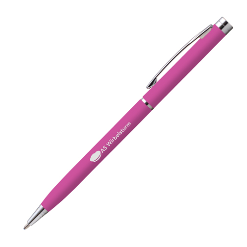 This new stylish ultra slim ballpen is an old time classic. Features a soft touch rubberised barrel with shiny chrome trim. Available in a choice of 4 vibrant colours. Twist action.