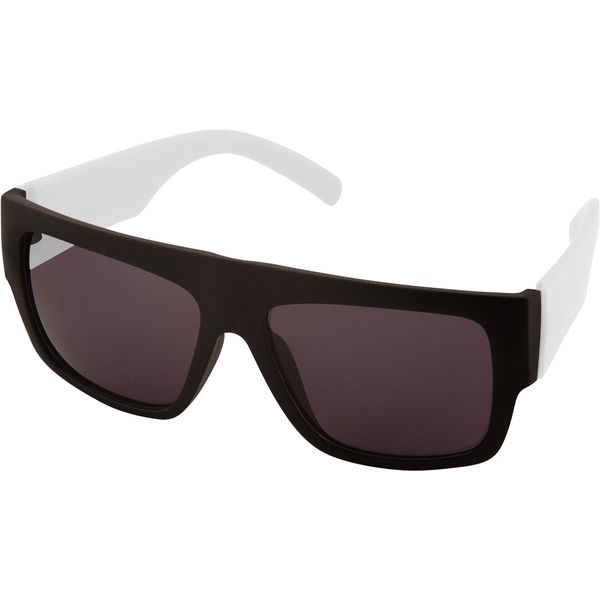 Flashy design two tone sunglasses with black frame, black category 3 lenses and wide pop up colour temples for large decoration.