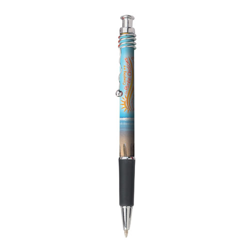 One of our most distinctive and eye catching styles, the retractable Monroe ballpoint pen comes with an art deco style, squiggle chrome clip and a soft rubber grip. Digitally printed, full colour to photo-quality, 360° around the barrel allowing you to maximise your brands full potential. Please note that the clip is moveable, allowing for a true 360º branding area.